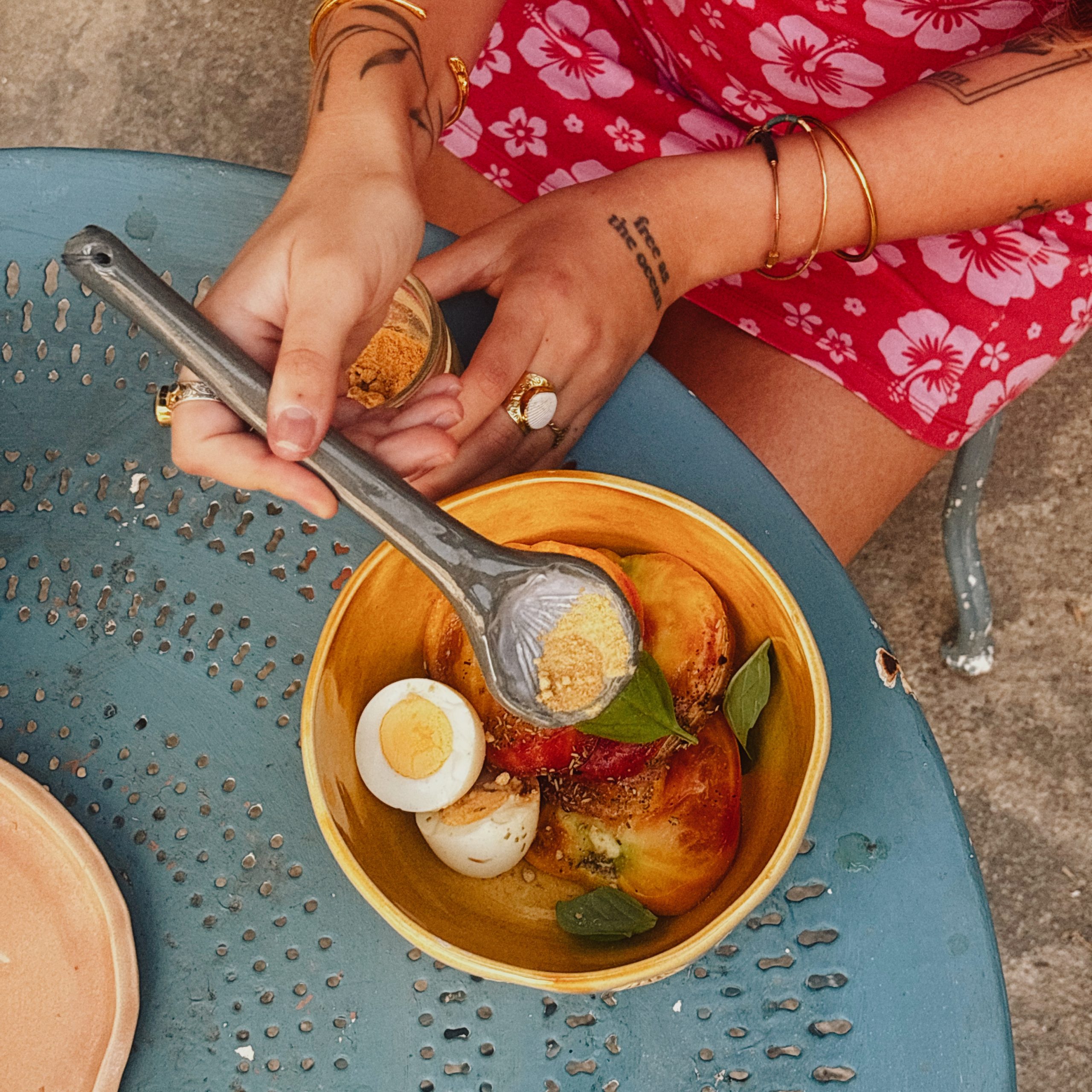 Façonnée et émaillée à la main, chaque cuillère mesure environ 20 cm de longueur, avec de légères variations qui rendent chaque pièce singulière 🐚